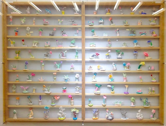 本展では、メインルームが、これまでの置物の探求を通して、多様性を備えつつも何か共通する独特の形態と原色を多用したカラフルな色彩の「ただの置物」が整然と並んだ一大コレクションルームとなります。ご注目頂ければ幸いです。(KUNST ARZT 岡本光博)