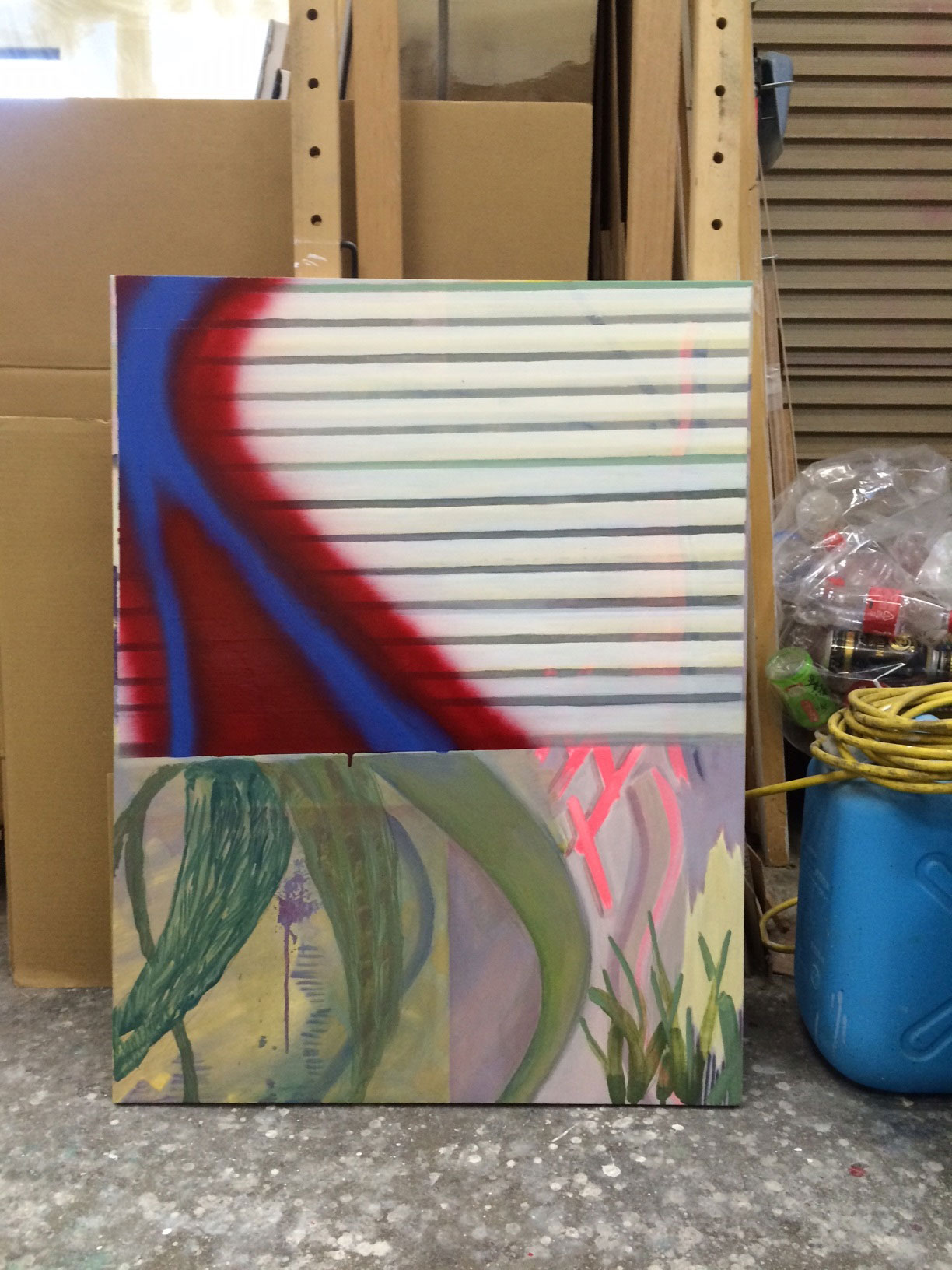 絵画による表現を追求する過程で、「『絵画』を突きつめるほど、身体化できなくなる」というジレンマに直面したという鬣は、日本において輸入された概念である「絵画」と、日本人である自身との隔たりを意識して制作を続けています。バナナやシャッター、ポスター、洗濯物など、身近な物質を画面の中で新たな形で捉え直すことで、絵画のコンテクストと自身の体験や身体性を重ね、両者の共通解を出現させようと試みます。
