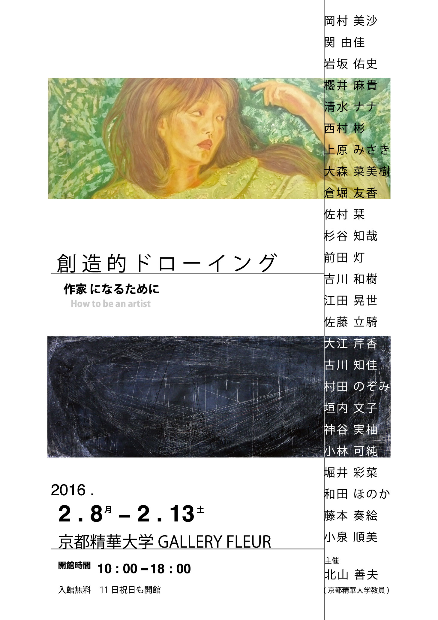 この展覧会は、京都精華大学芸術学部の「ドローイング(創造的ドローイング)」という授業の教員・アシスタント・受講学生が行なうものである。「ドローイング(創造的ドローイング」は、「作家になるために」をテーマに掲げ、コース枠を取り払い自由枠である。