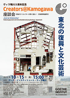 折しも、アーティスト・イン・レジデンスとなったヴィラ鴨川と東日本大震災は、どちらも今年5年となります。これまでヴィラ鴨川に滞在したドイツの芸術家の中には、滞在中、東北地方を訪れ、その印象を作品に反映させた人たちもいます。ヴィラ鴨川5周年記念の本座談会では、東北で活躍する日本のアーティストとともに、被災地で受けた印象や、被災地での創作活動の限界と可能性などについて、意見を交わします。