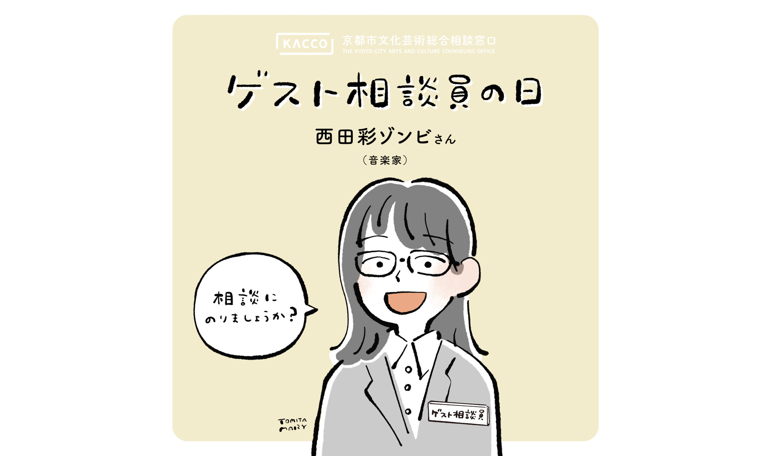 京都市文化芸術総合相談窓口[KACCO]には、これまで多くの文化芸術関係者からの相談が寄せられてきました。このゲスト相談員シリーズは、通常の相談ではなく、その時その場でその相手にしかできない「対話」を可能にする、1日限定のイベントです。第12回目のゲスト相談員として、音楽家・モジュラーシンセアーティストの西田彩ゾンビさんをお迎えします。