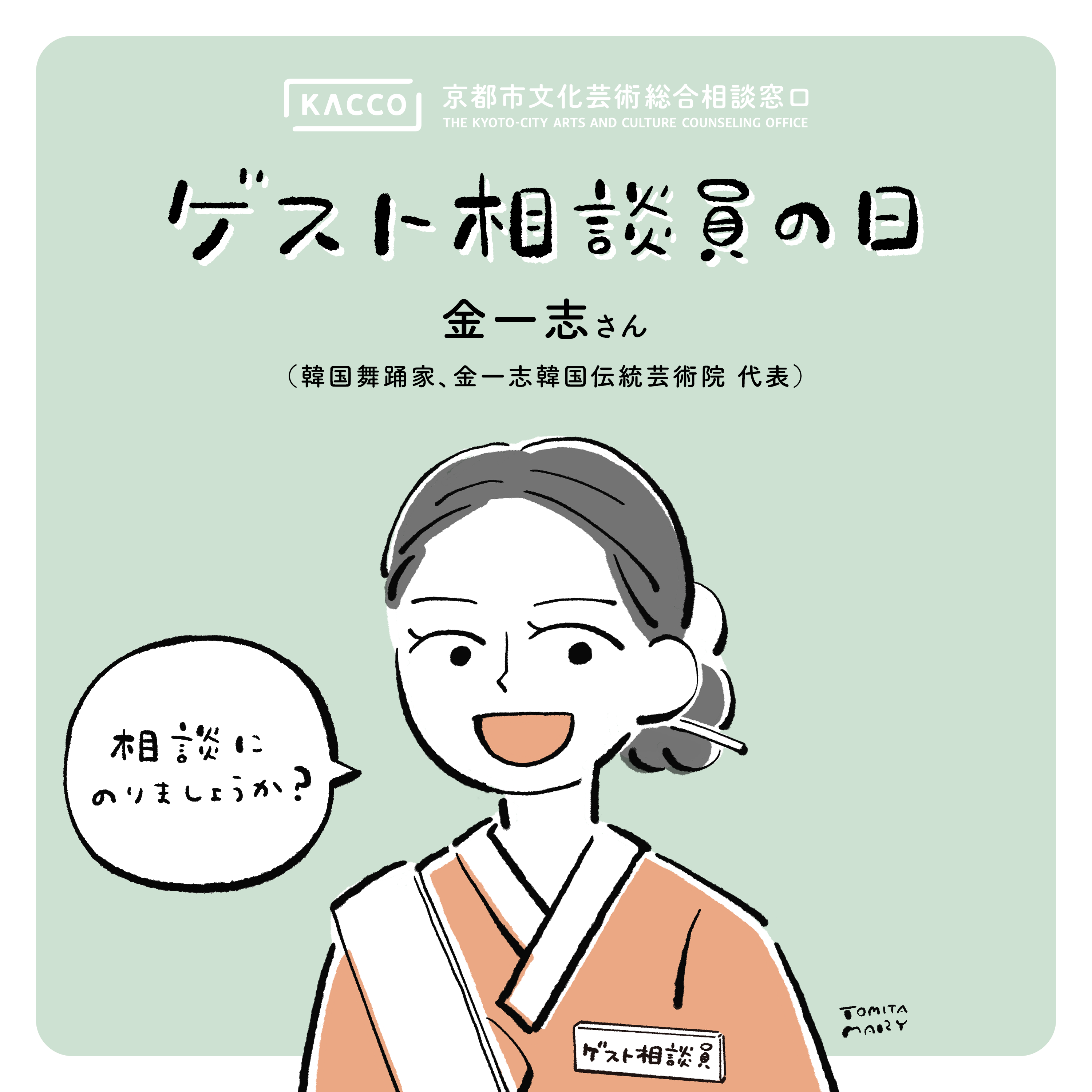 京都市文化芸術総合相談窓口[KACCO]には、これまで多くの文化芸術関係者からの相談が寄せられてきました。このゲスト相談員シリーズは、通常の相談ではなく、その時その場でその相手にしかできない「対話」を可能にする、1日限定のイベントです。第13回目のゲスト相談員として、韓国舞踊家で金一志韓国伝統芸術院 代表の金一志さんをお迎えします。